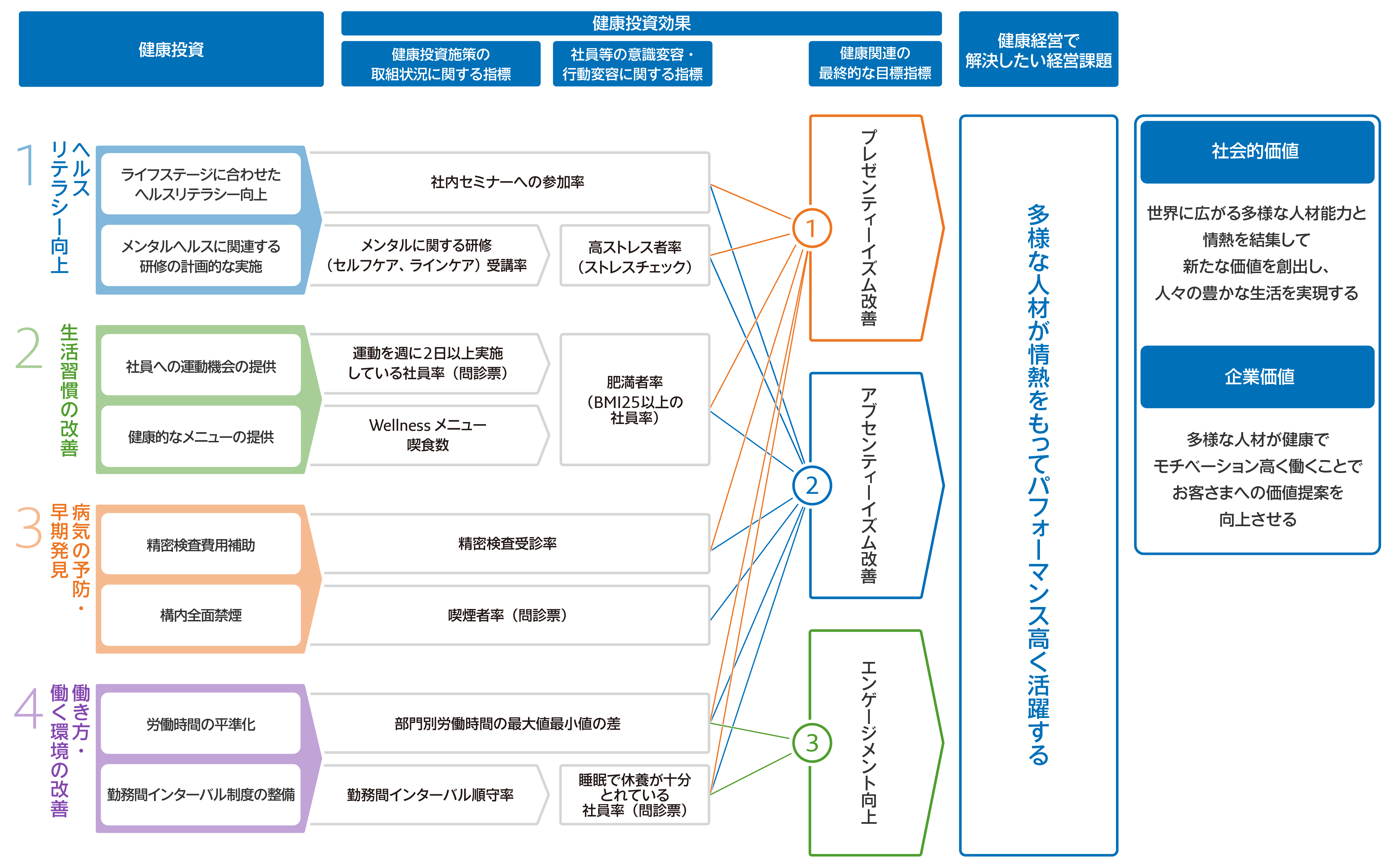 当社は健康経営戦略マップを用いて、健康経営を通じて解決したい経営課題とその課題を解消するための取り組みを可視化しています。
